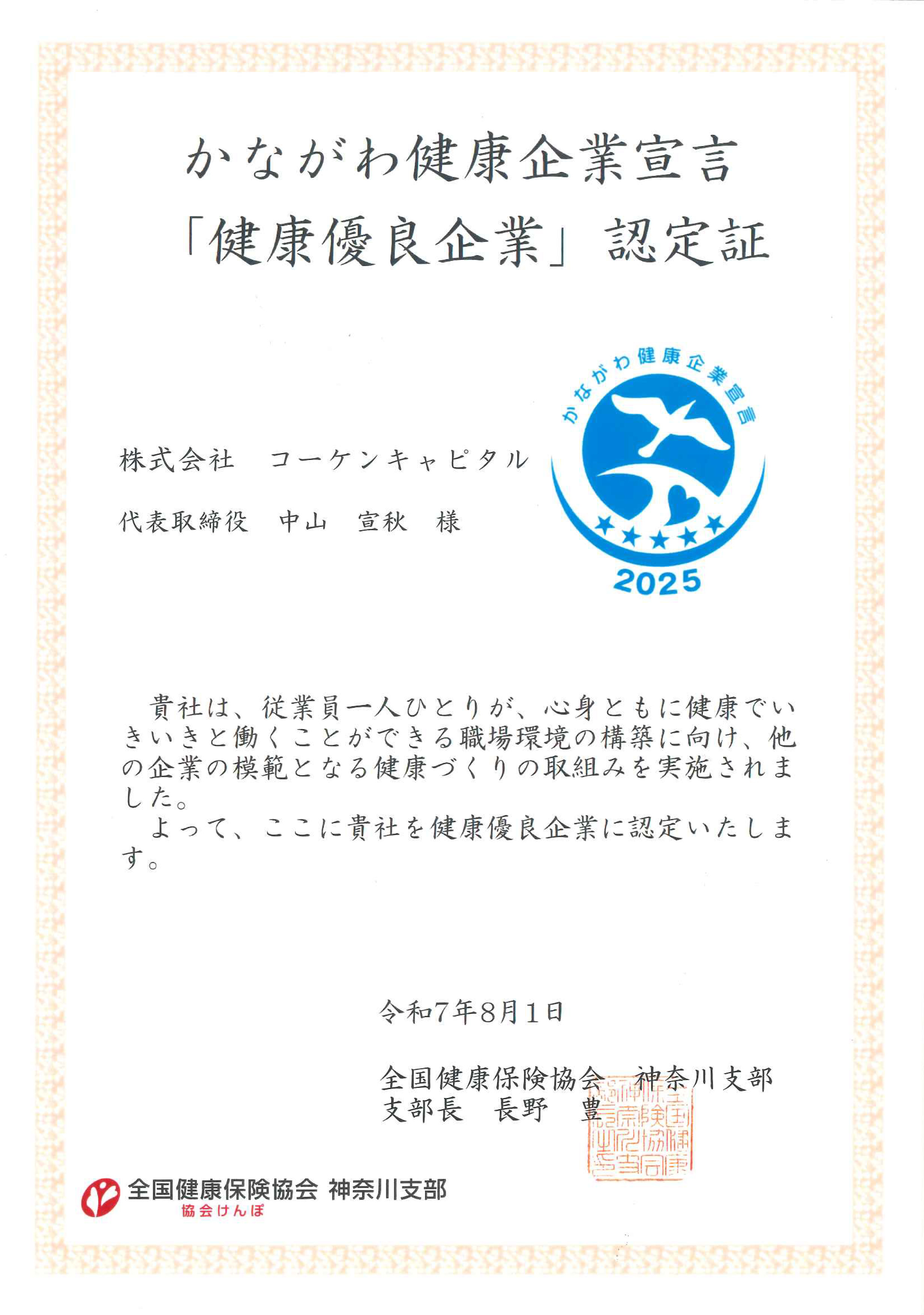 この度、2025年8月1日、全国健康保険協会神奈川支部より健康経営への取り組みが評価され、かながわ健康企業宣言【健康優良企業】に認定されました。従業員の健康増進、及び、働きやすく多様な人材が活躍できる職場環境の整備を整備し、SDGs宣言書に掲げた「働きがいのある職場づくり」に向けて、今まで以上に努めてまいります。